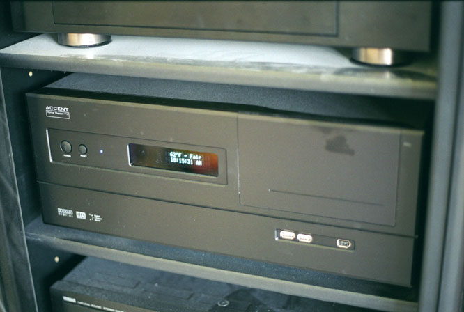 Ryans Home Theatre PC (HTPC)I have entertained the idea for quite a while of getting some piece of equipment that would allow me to have access to my music collection in mp3 format from my receiver in the family room. I had found such things as Dell's player, the SlimP3, and Turtle Beach's player. But, they were expensive, served only a single purpose, and were difficult to use from a distance (minus the slimp3). So, I decided to put together a Home Theatre PC (HTPC) to meet this demand. The overriding goals of this project were: it had to be quiet and use standard components that are upgradeable. I found the DIGN case via searching for HTPC on google, and fell in love with it. Best of all, it's a standard ATX case, so I didn't have to compromise on power supply space, or PCI cards. I saw a lot of microATX cases that were nice, but they were very limiting on what other components could be added, as well as reduced ventilation. I later found the case I would eventually buy, the Accent case, which my wife liked better esthetically. I saw one up on eBay, with the VFD display pre-installed, and snatched it up as fast as I could. The CaseThe case is pretty well built. The front looks just like a stereo component. The external drive door is held closed by two small round magnets at the top corners of the door. The top and side shell is a bit thin, but the frame itself seems sturdy enough. The shell slides on from the rear, coming up against the front plate without any guide or groove. The hard drive cage is removeable via 2 screws. It has to be removed in order to put the screws in the right side of the 5 ¼ inch bays and the left side of the 3 ½ inch bays. The VFD display took up the lower 3 ½ drive bay. For the front panel connections, it includes a USB cable from the front to individual pins on a motherboard, and the Firewire connection is actually a cable with the normal 6-pin connector to be plugged into an external connection-type plug (rather than a pin-based internal header). It came with a rear exhaust 60mm fan, and one more unused 60mm fan spot next to it. The fan is not very quiet, but pushes a pretty good amount of air. It did not come with a power supply (PSU), but it did have the VFD display installed already. The ComponentsI bought a Nexus NX300 300 watt power supply, which is supposed to be one of the quietest non-modded power supplies available. I can attest to this! By shorting the green cable to a black ground (to power up without a motherboard plugged in), I couldn't even tell that it had powered up! I bought a Papst 80mm fan to go on top of a Thermalright SLK-800a heatsink, two Adda 60mm fans to fill in the spots on the back of the case (these were vibration dampened, as they have a slight vibration sound when installed—missing when held in free air.), and the motherboard I bought had a small and noisy fan on it's northbridge chip. I took the beige CD-RW drive from one of my other computers to get it up and running. I will replace it shortly with a black Pioneer 106 DVD-R/RW burner. I bought a Seagate 120GB Barracuda V hard drive, with the Seashield and Fluid Dynamic Bearings. I can hear a slight spin up, and random access can be barely heard outside the case. For the motherboard, I bought an AOpen AK79G Max motherboard, which is an nForce2-based motherboard. With the onboard video, it won't even have an AGP card in it. With the onboard ethernet and sound, I won't have those PCI cards in it. The only PCI card in the box is a Hauppauge WinTV tuner card! (More on that later.) A wireless Logitech Keyboard/Mouse combo was added. 512MB of PC2700 DDR memory and an Athlon 1800 XP processor round out the package. Fans * SilenTek = Almost SilentOne reason I picked this motherboard is that it has what AOpen calls SilenTek. It allows the CPU fan and Fan2 to have their voltages controlled by software, based upon CPU and case temperatures, respectively. I have the CPU fan running at 1000 RPM if the processor's temperature is below 40° C. Then, it slowly ramps up to the full 12V if the processor gets up to 45° C. In this way, the CPU's fan is inaudible 99% of the time. The only time I've seen the fan spin up was when we turned off the A/C in the house for an afertnoon and the ambient temperature went up 10-15 degrees. It can also control one other fan header on the motherboard. I bought a 3-pin 'Y' cable so that the two 60mm case fans would also be dependant on ambient temperature. These spin at about 1500 RPM unless ambient case temperature goes over 35° C, which has only happened a few times. The north bridge chip fan is run through a Zalman FanMate I, so it is spinning between 2500 and 3000 RPM (rather than 4500-5000 RPM), making it blend into the base noise volume. What noise is audible comes from the 60mm exhaust fans and the northbridge fan. In the future, I plan on unplugging one of the 60mm fans to see what positive affect it has on the noise level and what negative affect it has on the internal ambient temperature. Overall, I love AOpen's SilenTek software! From about a 3 foot circle, you can barely hear a hushed white-noise fan sound as if it was coming from another room. Outside of the 3 foot circle, you can't hear anything. Being one of my main goals, I felt very happy about this. AssemblyIt went together pretty easily. Although it's 6 inches tall, it still feels a bit cramped inside. Sliding the motherboard into place was hard, with a 1-pound HSF on the one side! I took my time to fold the ATA cable for the optical drive under the motherboard, and twisty-tie all the cables from the power supply together and route them out of the way to maximize air flow. Integration With My StereoI wish my Yamaha receiver had another video input with associated digital audio inputs, but the DVD input is the only one. For now, I have it routed through as VCR 2 with stereo left/right just going through analog RCA jacks and the video going into the receiver via an S-Video cable. For som